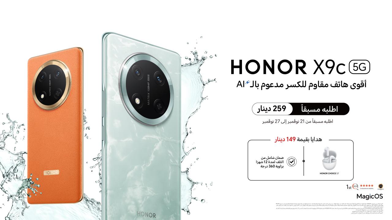 يتوفر هاتف HONOR X9c للطلب المسبق بأربعة ألوان جذابة تيتانيوم أرجواني، برتقالي مُشرق، تيتانيوم أسود، وأخضر سماوي. يمكن للمستهلكين طلب HONOR X9c مسبقًا عبر كافة نقاط البيع المعتمدة و متجر Cell Avenue الإلكتروني،نسخة 12+256 جيجابايت بسعر 259 دينار واحصل على هدايا بقيمة 149 دينار